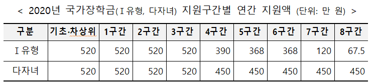 2020학년도 국가장학금은 학자금 지원구간 심사에 따른 월 소득 인정액(소득액+재산의 소득환산액)을 기준으로 지원 8구간 이하 학생들에게 연간 520만원부터 67만 5천 원 범위 내에서 지원한다.