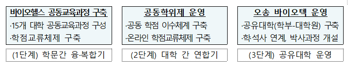 먼저 2021년부터 도내 15개 대학이 함께 참여하여 바이오헬스 분야 공유대학 기반을 구축하고, 도내 기업들이 인력 수급에 애로를 겪고 있는 석·박사급 인력을 중점 육성하는 ‘오송 바이오텍(Osong-BioTech)’을 운영할 계획이다.