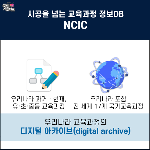 2008년부터 실시한 기초조사 연구를 기반으로 하여 2009년에 NCIC가 구축되었습니다. 현재는 조선시대부터 지금까지의 우리나라 교육과정과 1945년 이후 유초중등 교육과정을 정리하여 문서를 제공하고 있습니다. 이뿐만 아니라 우리나라를 포함한 영국, 핀란드 등 전 세계 17개 국가의 교육과정도 찾아볼 수 있습니다. 이렇게 다양한 교육과정을 담고 있어 교육과정의 디지털 아카이브(digital archive)라고 부르고 있습니다.