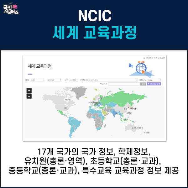 NCIC(National Curriculum Information Center, 국가교육과정정보센터)는 교육부와 한국교육과정평가원에서 운영하는 국내외 교육과정 정보 공유 시스템입니다.