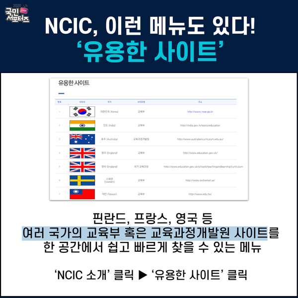 혹시 국가별 사이트가 궁금하신가요? 그럼 이 메뉴를 추천합니다. 바로 ‘NCIC 소개’에 있는 ‘유용한 사이트’입니다. ‘유용한 사이트’에서는 핀란드, 프랑스, 영국 등 여러 국가의 교육부나 교육과정개발원 사이트를 한 공간에서 쉽고 빠르게 찾을 수 있는 메뉴입니다.