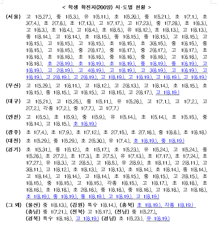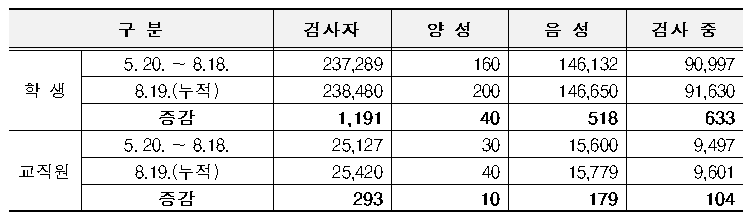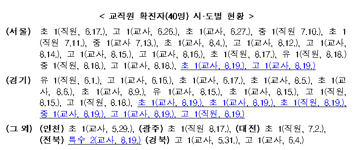 - 등교 이후 확진자 8.19.(수) 00시 대비 학생 40명, 교직원 10명 증가