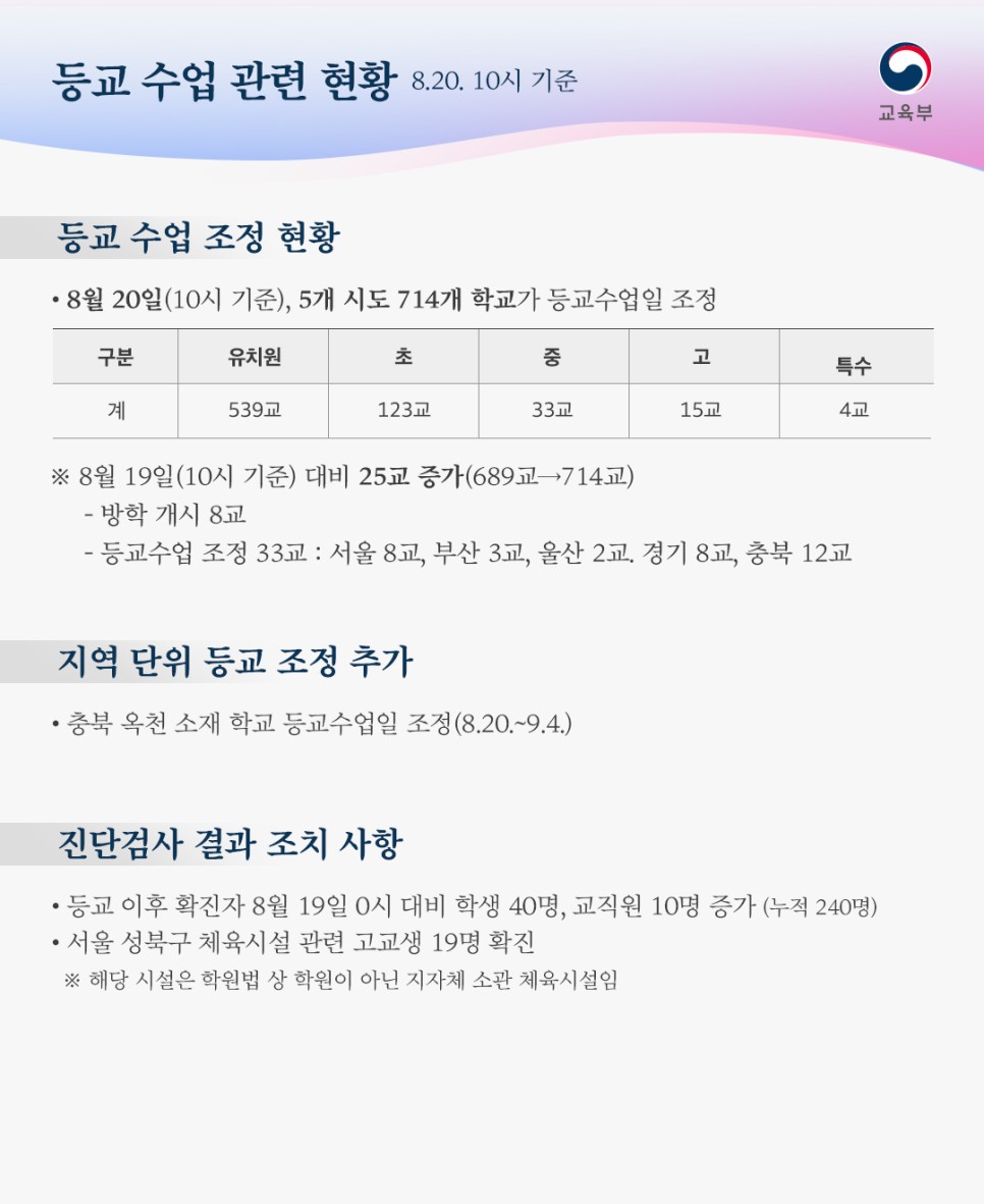 - 8월 19일 0시대비 학생 40명, 교직원 10명 증가(누적 240명)