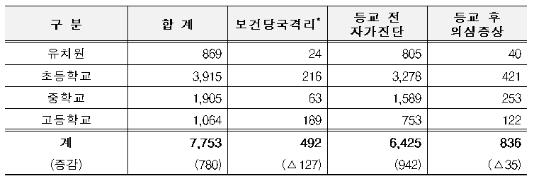 학생 미등교 사유별 현황 (8.20. 16시 기준) <단위 : 명>