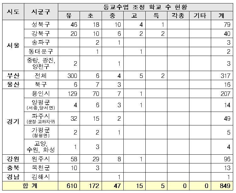 * 서울 12교, 부산 5교, 울산 5교, 경기 17교, 강원 96교, 충북 2교, 경남 1교