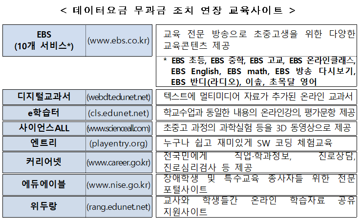 안정적인 온라인 수업에 필수적인 EBS, e학습터, 디지털교과서 등을 주요 학습사이트를 대상으로 데이터 무과금조치를 지속하며, 또한, 건전한 실내 활동을 지원하고, 가정에서 자가 자가주도학습을 할 수 있도록, 사이언스ALL(과학), 엔트리(SW·코딩교육), 커리어넷(진로상담) 등 관련 사이트도 데이터 무과금조치로 계속 지원한다.