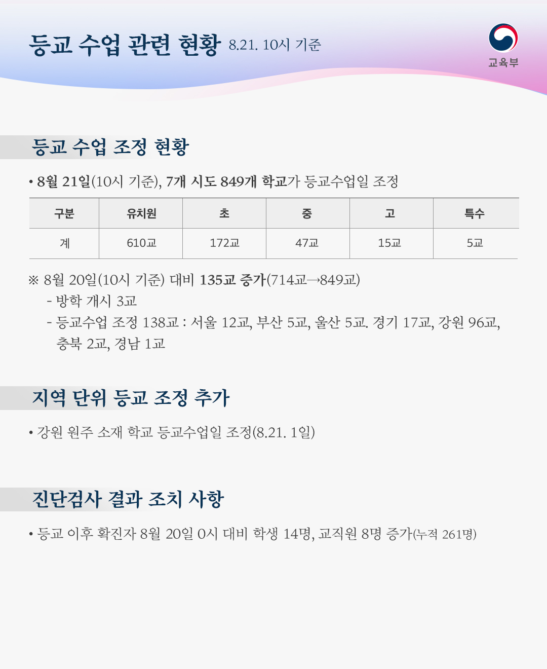 - 8월 20일 0시 대비 학생 14명, 교직원 8명 증가(누적 261명)
