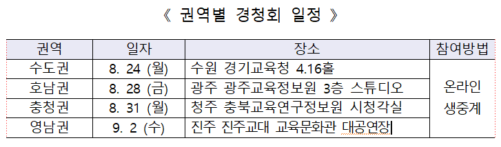경청회는 8월 24일부터 9월 2일까지 4개 권역에서 개최되며, 사회적 거리두기를 위해 무청중 온라인 생중계(국가교육회의 유튜브)로 진행된다.