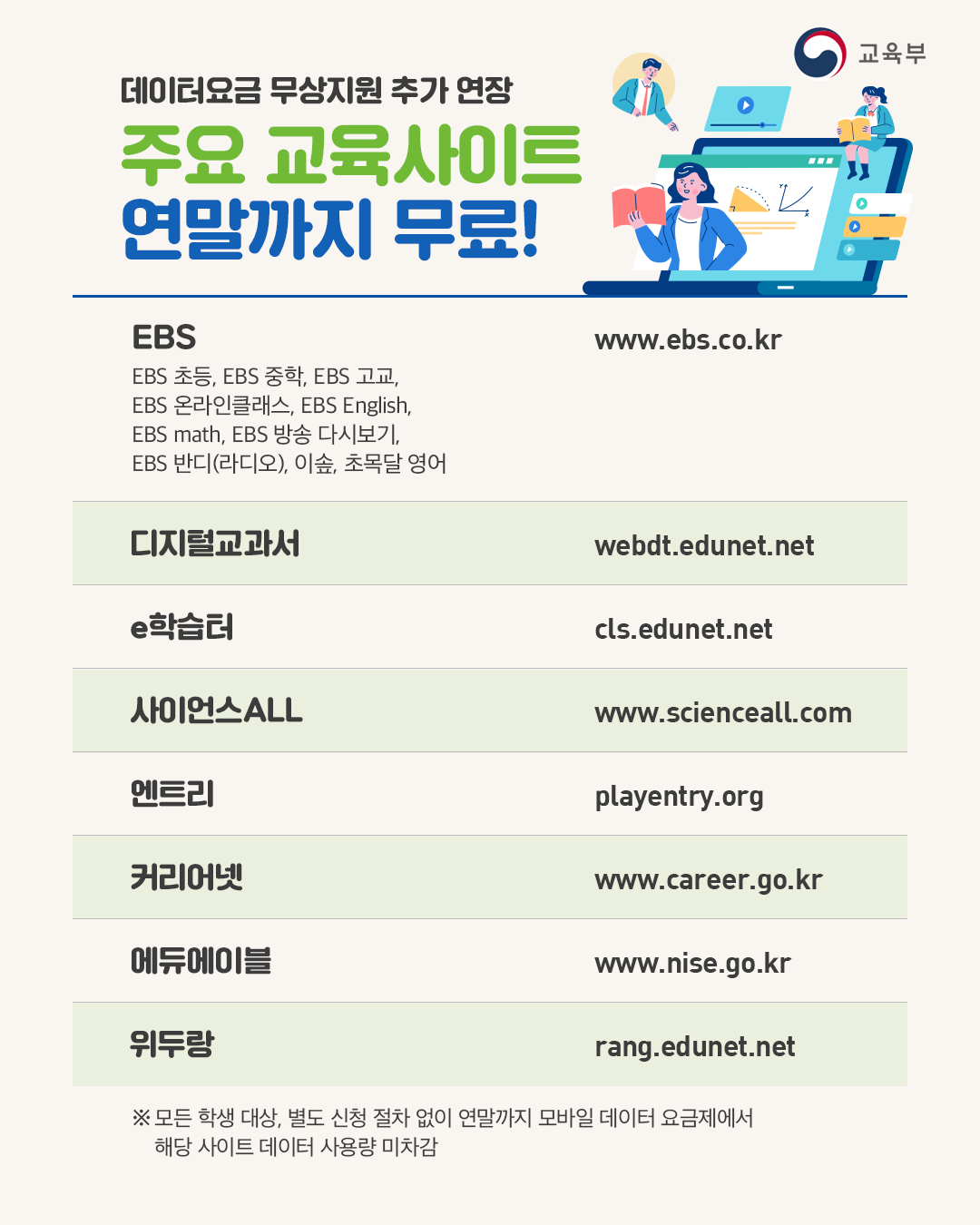 주요 교육 사이트 데이터 사용량을 차감하지 않는 조치를 올해 연말까지 연장하기로 결정하였습니다.