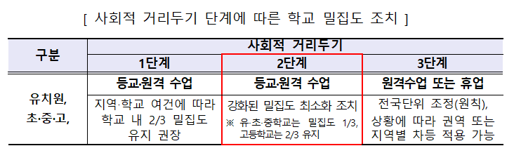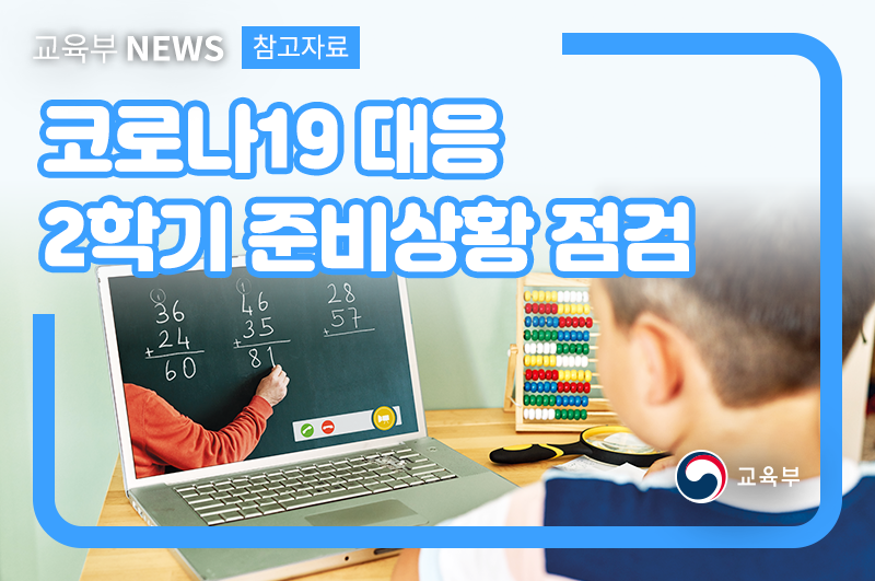 지난 8월 6일 교육부는 「2020학년도 2학기 학사운영 세부 지원방안」을 발표하고, 사회적 거리두기 단계별 등교‧원격수업 방식 및 탄력적인 교육과정(수업), 평가, 기록 방안 등을 안내했으며, 서울, 경기지역 사회적 거리두기 단계가 2단계로 격상(8.16)됨에 따라, 부총리 주재 시도교육감 영상회의(8.19)를 통해 학교 밀집도 등 교육분야 세부 후속조치 사항을 결정한 바 있다.