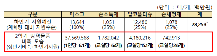 이를 통해 전체 학교에서 마스크 1인당 6.1개, 손소독제 교실당 6.4개, 손세정제 교실당 2.6개 이상 비축이 가능할 것으로 예상된다.