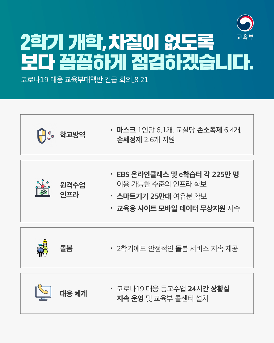 2학기 개학을 앞두고 학교 방역 및 원격수업 인프라, 돌봄서비스 운영 등에 있어 차질이 없도록