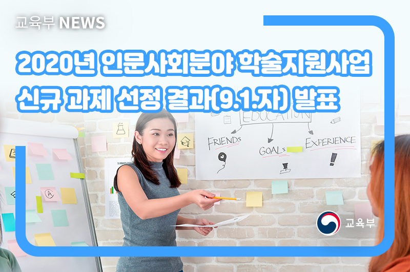 교육부(부총리 겸 교육부장관 유은혜)와 한국연구재단(이사장 노정혜)은 8월 25일(화), 학문후속세대 지원을 강화하기 위한 ‘2020년 인문사회학술연구교수 지원사업(B유형) 과제 2,909개의 최종 선정결과를 발표하였다.