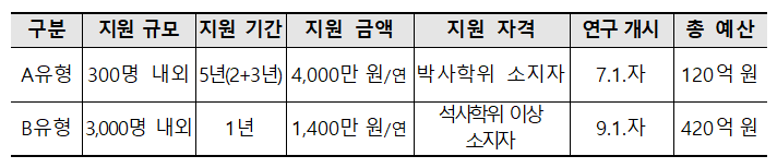또한, 기존에는 대학의 추천과 승인을 받은 연구 과제만을 지원하였으나, 지난 7월 연구 개시한 A유형과 마찬가지로 대학 밖 연구자나 소속이 없는 연구자의 경우에도 안정적인 지원을 받을 수 있도록 개선하였다.