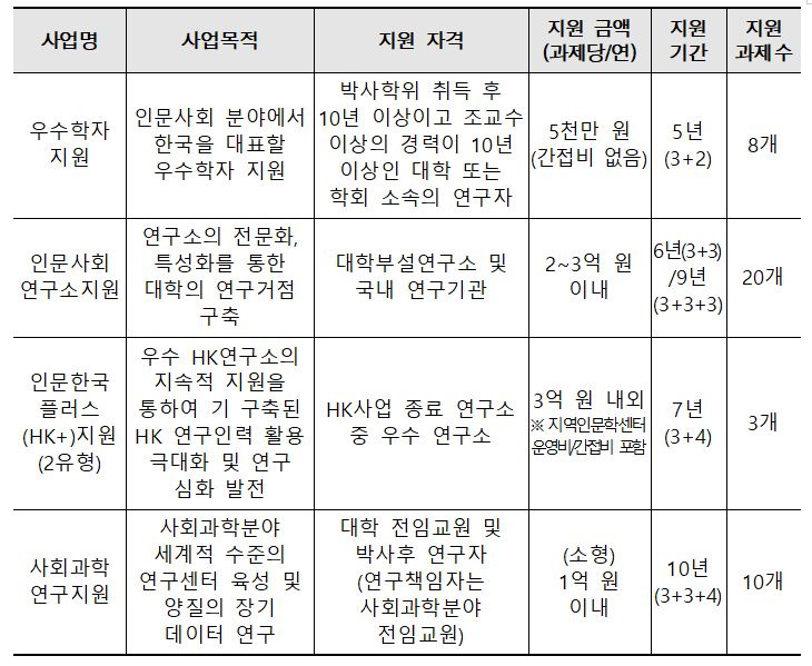 ◈ 인문사회 기초연구, 인문학 진흥 및 사회과학 연구지원 등을 위한