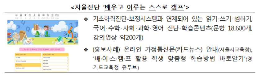 전면 원격수업 기간 중 학습 결손 최소화를 위해 기초학력이 부족한 학생을 대상으로 온라인 기초학력 지도 및 학습을 강화한다. 원격수업 및 가정학습을 통해서도 학생 스스로 기초학력을 진단·학습할 수 있는 초‧중 온라인 콘텐츠(배・이・스・캠・프)를 적극 활용할 수 있도록 안내한다.