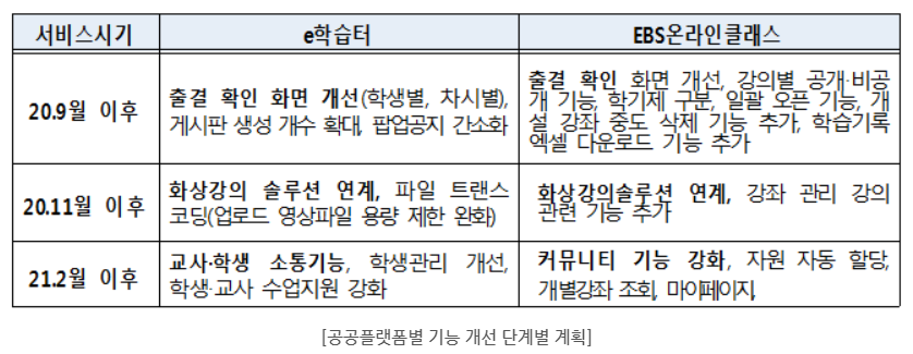 수도권 지역 전체가 원격수업으로 전환됨에 따라 안정적인 원격수업을 위한 인프라 및 원격수업 학습콘테츠 지원을 강화한다. 온라인클래스, e학습터를 1학기 전면 원격수업 인프라 수준(각 300만 명 이용가능)으로 증설을 완료(8.23.)하였고, 출결관리 및 실시간 쌍방향 화상강의 서비스 기능 추가 등 단계적으로 시스템을 개선한다. 또한, 플랫폼 담당 기관(온라인클래스-EBS, e학습터-KERIS)에 현장 상황실을 구성하여 플랫폼 오류 발생에 신속히 대응하도록 한다.(8.23.∼)