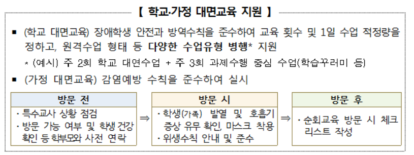 특수학교의 경우에는 사회적 거리두기 단계별 학교 밀집도 조치에도 불구하고, 학교가 시도교육청과 협의하여 학사운영 방안을 결정하도록 한다. 전면 원격수업 전환 시, 원격수업이 어려운 장애학생의 특성을 고려하여 학습꾸러미 제공, 학교(급)별 특색 활동, 방역수칙을 준수한 1:1 또는 1:2 학교․가정 대면교육 등을 병행할 수 있도록 지원한다.