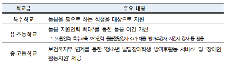 또한, 원격수업 기간 중 장애학생 돌봄 부담 완화를 위해 학교급별 특성에 맞게 장애학생 돌봄을 제공하고, 특수교육 보조인력을 통해 돌봄 운영을 지원할 예정이다.