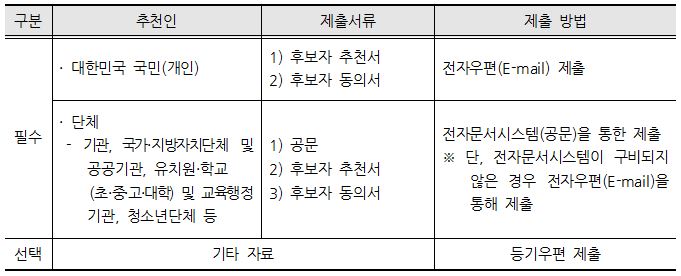 수상 후보자 추천서 및 동의서를 작성하여 이메일 또는 공문을 통해 제출합니다.