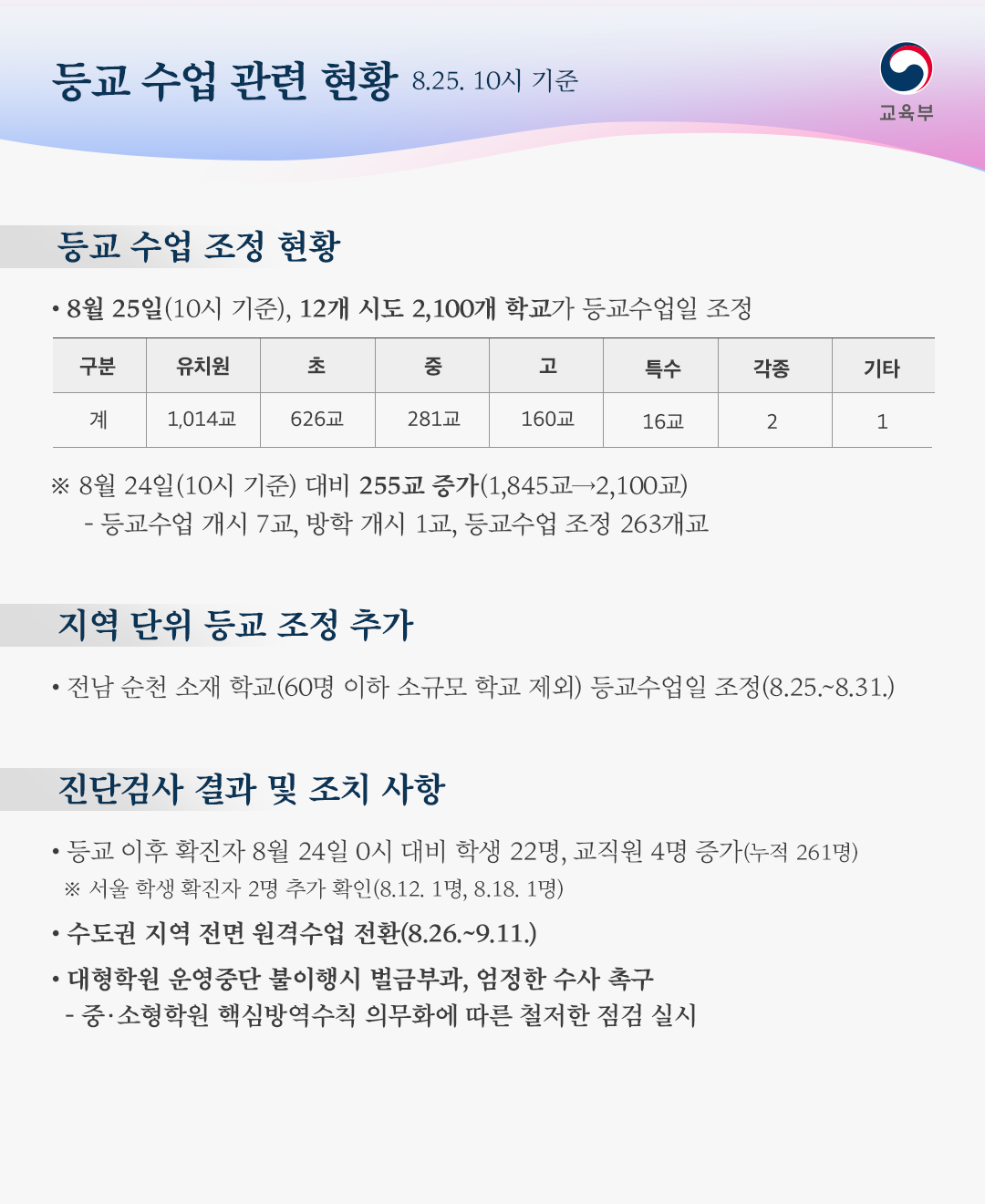 - 8월 24일 0시 대비 학생 22명, 교직원 4명 증가(누적 261명)