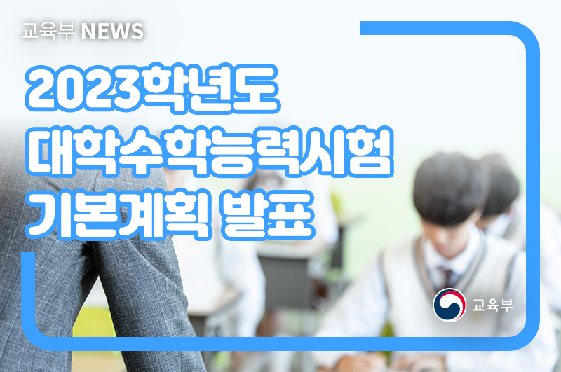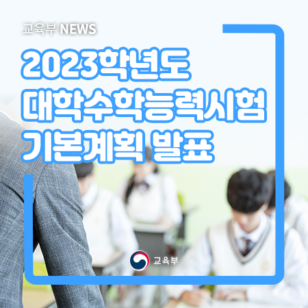 교육부(유은혜 부총리 겸 교육부장관)는 8월 27일(목)에 2023학년도 대학수학능력시험 기본계획을 발표하였다. 2023학년도 대학수학능력시험은 현재 고교 1학년학생들이 2022년에 응시할 시험으로, 국어, 수학 ‘공통+선택’ 과목 구조, 제2외국어/한문 절대평가 등 2022학년도부터 변경되는 대학수학능력시험의 체제가 동일하게 적용된다.