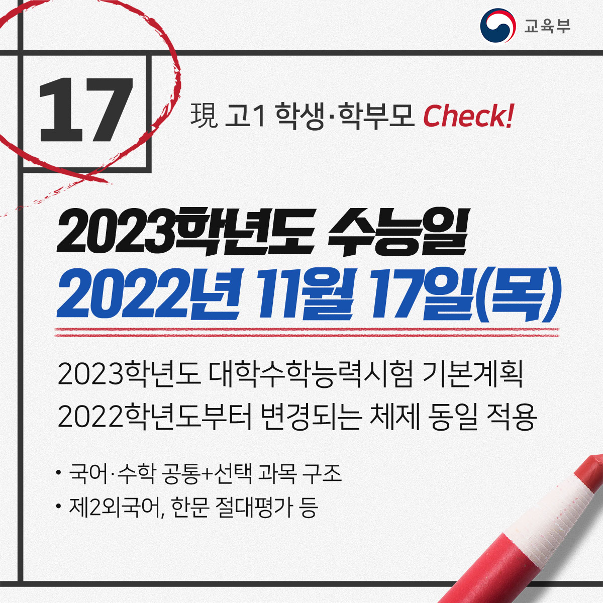 현재 고교 1학년 주목, '23학년도 수능은 '22년 11월 17일(목)입니다. 본문