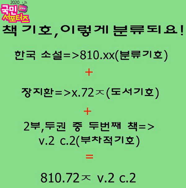 우선 아동용 책, 향토자료, 고문헌, 참고자료 등과 같은 특별한 자료는 별치기호가 부여되지 않습니다. 그리고 문학, 그중에서도 한국 소설에 속하기 때문에 한국 십진분류표의 세부 분류에 따라서 810.xx, 그리고 장지환 작가의 성인 장을 기준으로 리재철 한국순도서기호법 제5표에 따라서 이 책의 도서기호는 810.72ㅈ이 됩니다. 다음으로 2권을 찾아 읽는 것이므로 이 책의 권호는 v.2, 그리고 2권을 기준으로 두 번째 책을 읽고 싶은 것인 만큼, 해당 책의 복본기호는 c.2가 추가되어 최종적으로는 810.72ㅈ v.2 c.2가 됩니다.