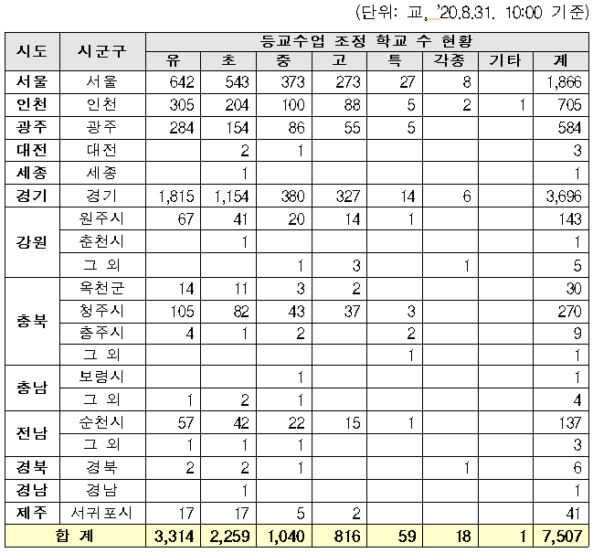 ㅇ 8.31.(10시 기준) 13개 시·도 7,507개 학교가 등교 수업일 조정 중