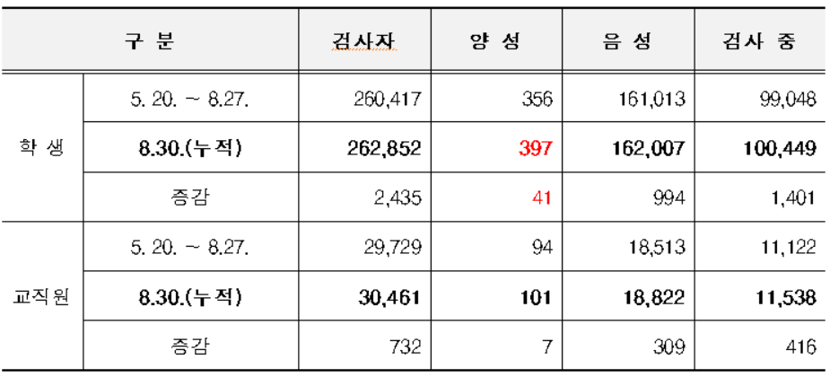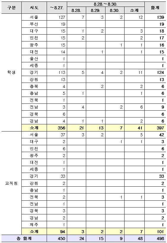 - 등교 이후 확진자 8.28.(금) 00시 대비 학생 41명, 교직원 7명 증가 【누적 498명(학생 397명, 교직원 101명)】