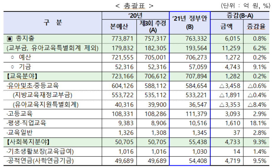 교육부(유은혜 부총리 겸 교육부 장관)는2021년도 교육부 예산안을2020년도 예산(제3회 추가경정예산) 75조 7,317억 원 대비 6,015억 원 증가한76조 3,332억 원으로 편성하였다고 밝혔다.