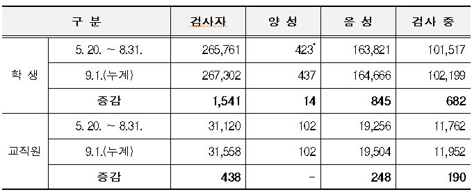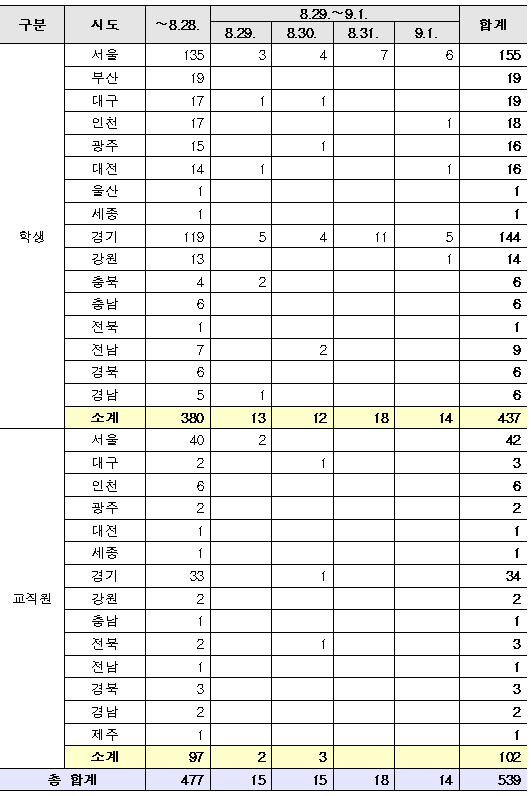 - 등교 이후 확진자 누계 9.1.(화) 00시 대비 학생 22명 증가 【누계 539명(학생 437명, 교직원 102명)】