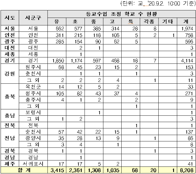 - 9.1.(10시 기준) 8,052교에서 156교 증가(1교 등교수업 개시, 157교 등교수업 조정)