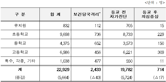* 진단검사 결과 확진 판정 또는 확진자와의 접촉으로 인한 보건당국 격리자