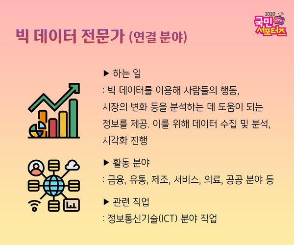 : 기업의 내/외부 데이터를 분석하여 기업 경영에 도움이 되는 정보를 만들어 제공하며, 정보 통신 기술(ICT) 분야의 직업인 컴퓨터 시스템 설계 분석가, 시스템 소프트웨어 개발자, 응용 소프트웨어 개발자 등의 직업과 관련성이 높습니다.