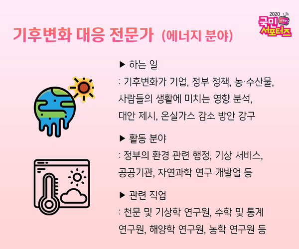 : 천문 및 기상학 연구원, 수학 및 통계 연구원, 해양학 연구원, 농학 연구원 등의 직업과 관련성이 높으며, 기후변화 대응 전문가는 수학과 통계, 물리, 생물학, 지리학 등 다양한 분야의 전문가들의 도움을 받아 기후변화를 분석해야 합니다.