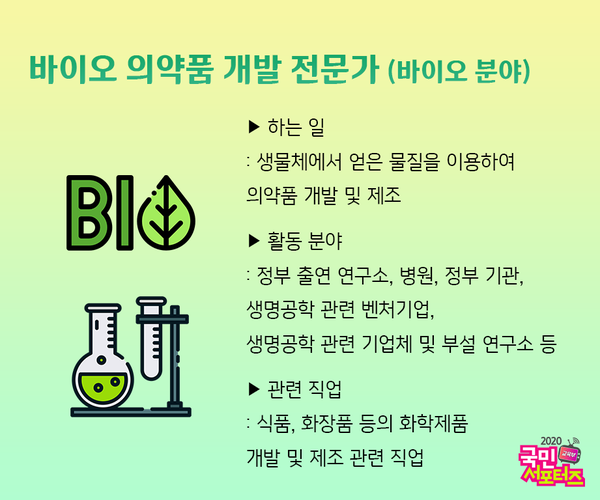화학적으로 만들어낸 물질이 아닌 생물체에서 얻은 물질을 이용하여 의약품을 개발하고 만드는 일을 합니다.