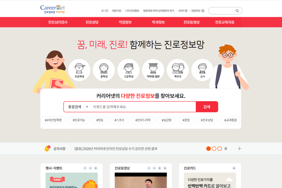 또한 커리어넷은 초·중·고등학생 뿐 아니라 대학생과 일반인, 학부모, 그리고 교사도 이용 가능한 사이트인 만큼 진로심리검사도 중·고등학생용과 대학생·일반인용이 구분되어 제공 중이며, 교사를 위한 진로지도 보조 자료 및 학부모용 진로 정보도 제공하고 있습니다.