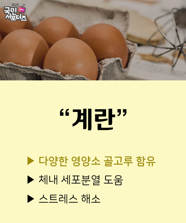 계란은 엽산 성분을 다량 함유하고 있어 우리 몸의 세포분열에 큰 도움을 주는 음식입니다. 그리고 단백질이 매우 풍부하고, 나트륨이 적으며, 비타민과 무기질 등 우리 몸에 꼭 필요한 영양소를 많이 함유하고 있는데요. 다양한 영양소를 골고루 갖춘 식품으로 영양의 불균형이 심한 수험생들에게 딱좋은 음식입니다. 계란은 스트레스 해소에도 도움을 준다고 하니 시험을 앞두고 긴장감과 불안함을 느낄 때 섭취하면 좋을 것 같습니다.