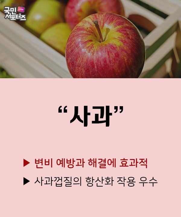 장시간 책상에 앉아 공부해야 하는 수험생들의 최대 적은 바로 변비인데요. 변비에 큰 도움을 주는 음식이 바로 사과입니다. 사과는 펙틴이라는 수용성 식이 섬유소를 다량 함유하고 있어 변비 예방과 해결에 상당히 효과적입니다. 또한, 사과껍질에 들어 있는 퀄세틴이라는 성분은 항산화 작용이 뛰어나서 항바이러스, 항균작용에도 큰 도움이 된다고 합니다.