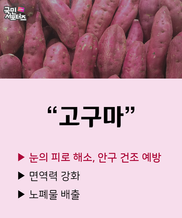 오랜 시간 동안 책을 보거나 인터넷 강의를 들으면 눈이 쉽게 피로해집니다. 피로해진 눈에 좋은 음식은 고구마인데요. 고구마는 눈에 좋은 영양소인 비타민A를 다량 함유하고 있어 눈의 피로를 풀어주고 안구 건조까지 예방해 줍니다. 또한, 베타카로틴이라는 항산화 성분을 함유하고 있어 수험생들의 면역력 강화에도 큰 도움을 주며, 고구마 속의 식이섬유는 몸 속 노폐물 배출에 상당히 탁월하답니다.