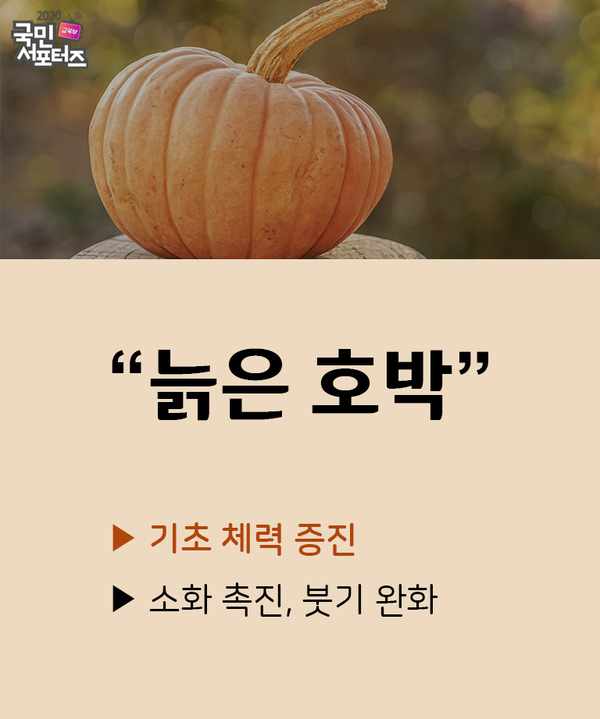 비타민 A와 미네랄이 풍부한 늙은 호박은 수험생들의 기초 체력을 증진시켜주는 음식입니다. 호박은 식욕을 돋우고 소화를 촉진시키며 붓기를 가라앉히는 데에도 효과적이어서 운동량이 부족하고 책상에 오래 앉아있어야 하는 수험생들의 속을 편안하게 해 줄 아주 좋은 음식입니다.