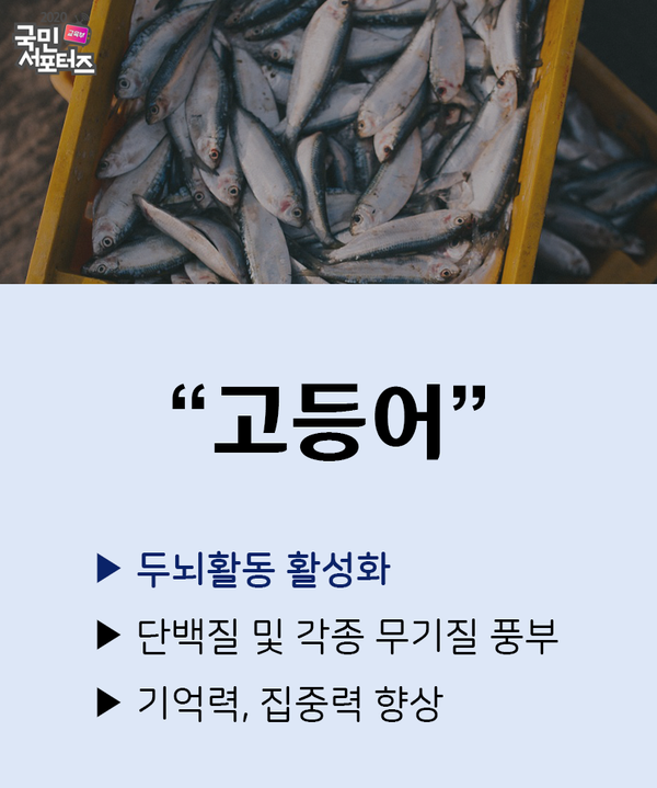 등 푸른 생선이 몸에 좋다는 얘기 많이 들어보셨을 것 같습니다. 대표적인 등 푸른 생선 중 하나인 고등어는 단백질과 각종 무기질이 풍부하며 오메가-3 지방산인 DHA와 EPA를 다량 함유하고 있어 수험생들의 두뇌활동을 활발하게 하는 데 아주 적격인 음식입니다. 장기간 공부하다 보면 후반부로 갈수록 집중력이 떨어지기 쉬운데요, 그럴 때 고등어를 꾸준히 섭취하면 두뇌활동에 큰 도움이 될 것 같습니다.