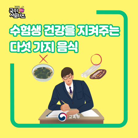 어느덧 9월입니다. 2021학년도 대학수학능력시험도 얼마 남지 않았는데요. 하루종일 책상에 앉아서 장시간 공부하다 보면 소화도 잘 안 되고, 집중력도 떨어지고, 피로도 쌓이기 마련이죠. 오늘은 이런 수험생 여러분들을 위해서 건강에 좋은 다섯 가지 음식을 소개해드리려고 합니다!