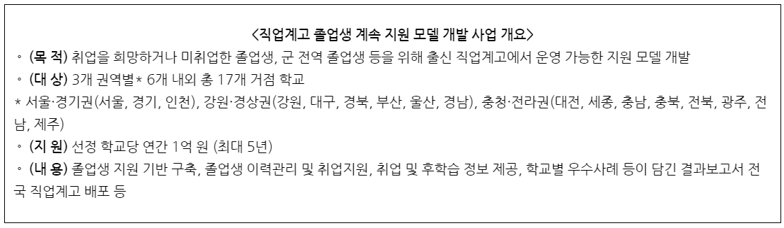 또한,인근 학교 및 유사 계열 졸업생들을 대상으로 시‧도 교육청 취업지원센터 등과 연계한 취업 지원 프로그램을 운영하는 한편,매년 결과보고서를 발간하고 전국 직업계고에 배포하여 졸업생 지원과 관련된 우수 사례 등을 공유하고 확산할 예정이다.
