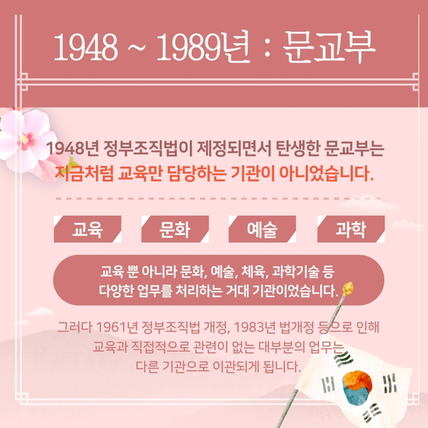 1948년 정부조직법이 제정되면서 탄생한 문교부는 지금처럼 교육만 담당하는 것이 아니라, 문화·예술·체육·과학기술정책 등 여러 가지 업무를 하는 거대 기관이었습니다. 심지어 1956년에는 원자력관리에 대한 업무도 맡을 정도로 굉장히 다양한 일을 하였습니다.