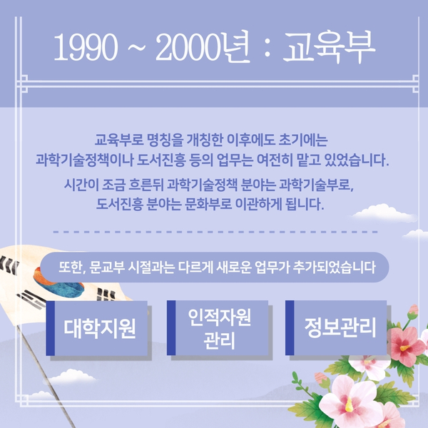 문교부와는 다르게 문화, 체육, 예술이 아닌 교육과 관련이 된 업무를 주로 맡게 된 교육부. 하지만 교육부로 명칭을 개칭한 이후에도 초기에는 여전히 과학기술정책이나 도서진흥 등의 업무를 맡고 있었습니다. 그러다 시간이 조금 흐른 뒤 과학기술정책 분야는 과학기술부로, 도서진흥 분야는 문화부로 이관하게 됩니다.