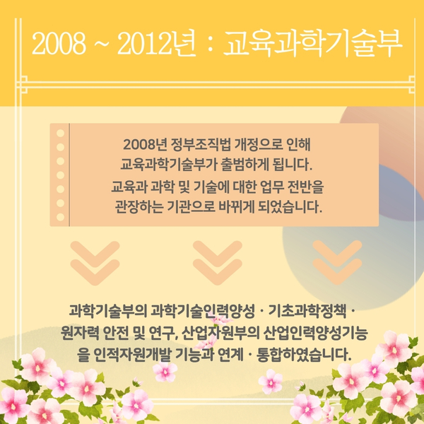 2008년 정부조직법 개정으로 인해 교육과학기술부가 출범하게 됩니다. 교육과 과학 및 기술에 대한 업무 전반을 관장하는 기관으로 바뀌게 되었습니다. 이전 교육인적자원부의 대학 입학과 관련된 업무를 한국대학교육협회에 이관하고 나머지 기능을 과학기술부와 합친 것입니다.