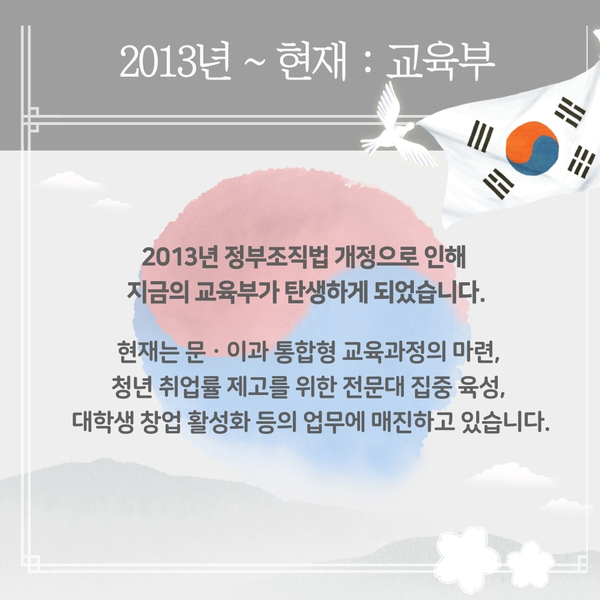 그리고 2013년 정부조직법 개정으로 인해 지금의 교육부가 탄생하게 됩니다. 지금의 교육부는 과학과 기술 관련 분야는 과학기술정보통신부로 이관을 하였습니다.