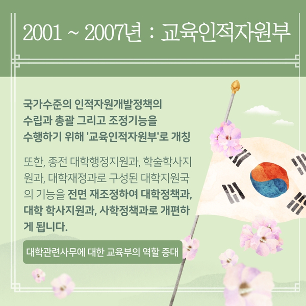 국가수준의 인적자원개발정책의 수립과 총괄 그리고 조정기능을 수행하기 위해 '교육인적자원부'로 개칭하게 됩니다. 그리하여 인적자원의 개발 및 관리업무를 효율적으로 수행하고자 일부 국의 명칭과 기능을 조정하고, 감사기능 강화 등을 위하여 필요한 인력을 증원합니다.